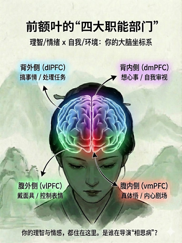 前额叶是我们大脑的CEO,它并不是铁板一块,而是被一个精密的“十字坐标系”分成了四个象限: