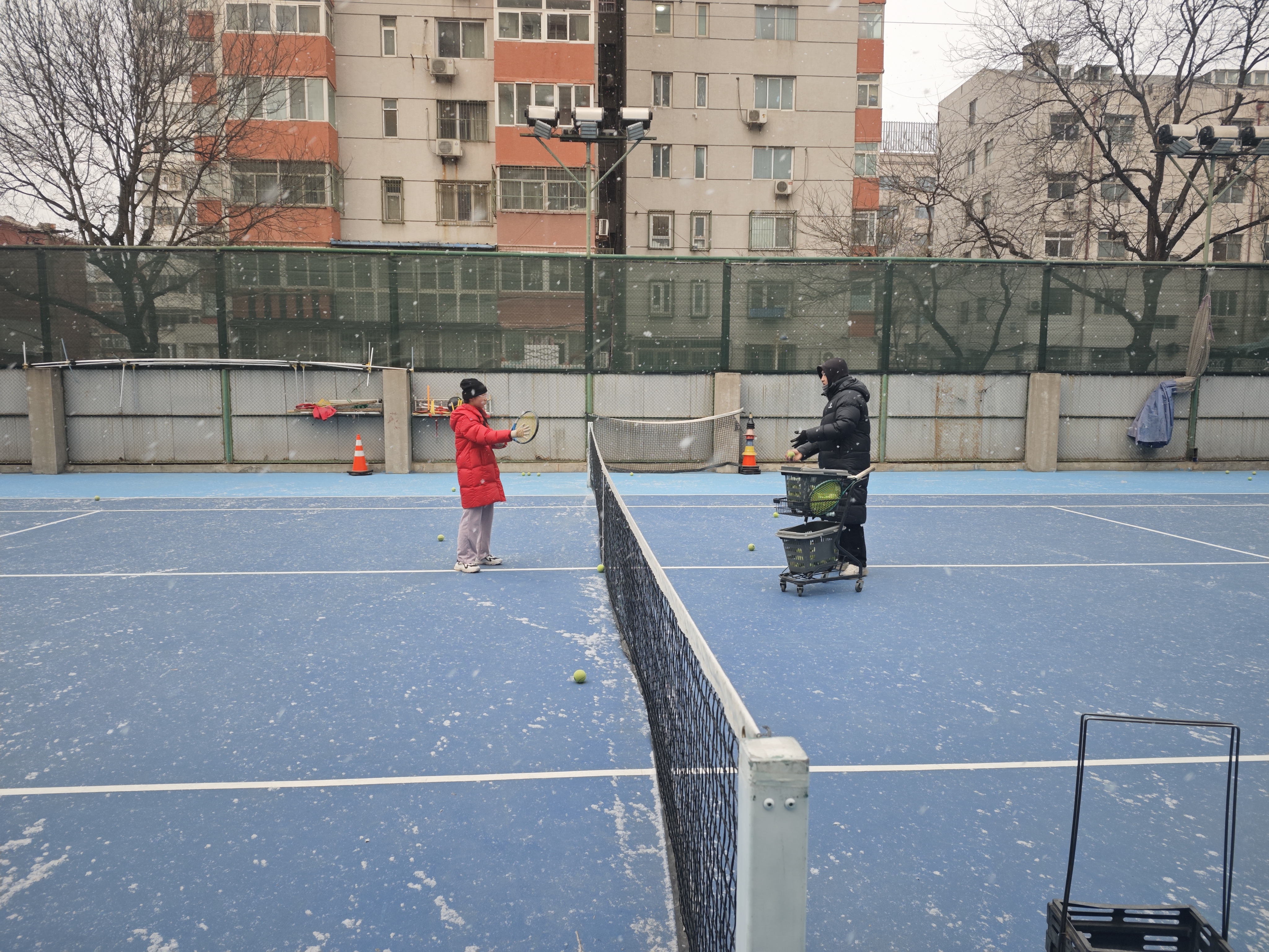 周六8点,带着孩子去打网球,正好下了小雪。她已经坚持两年了,最近状态蛮好。